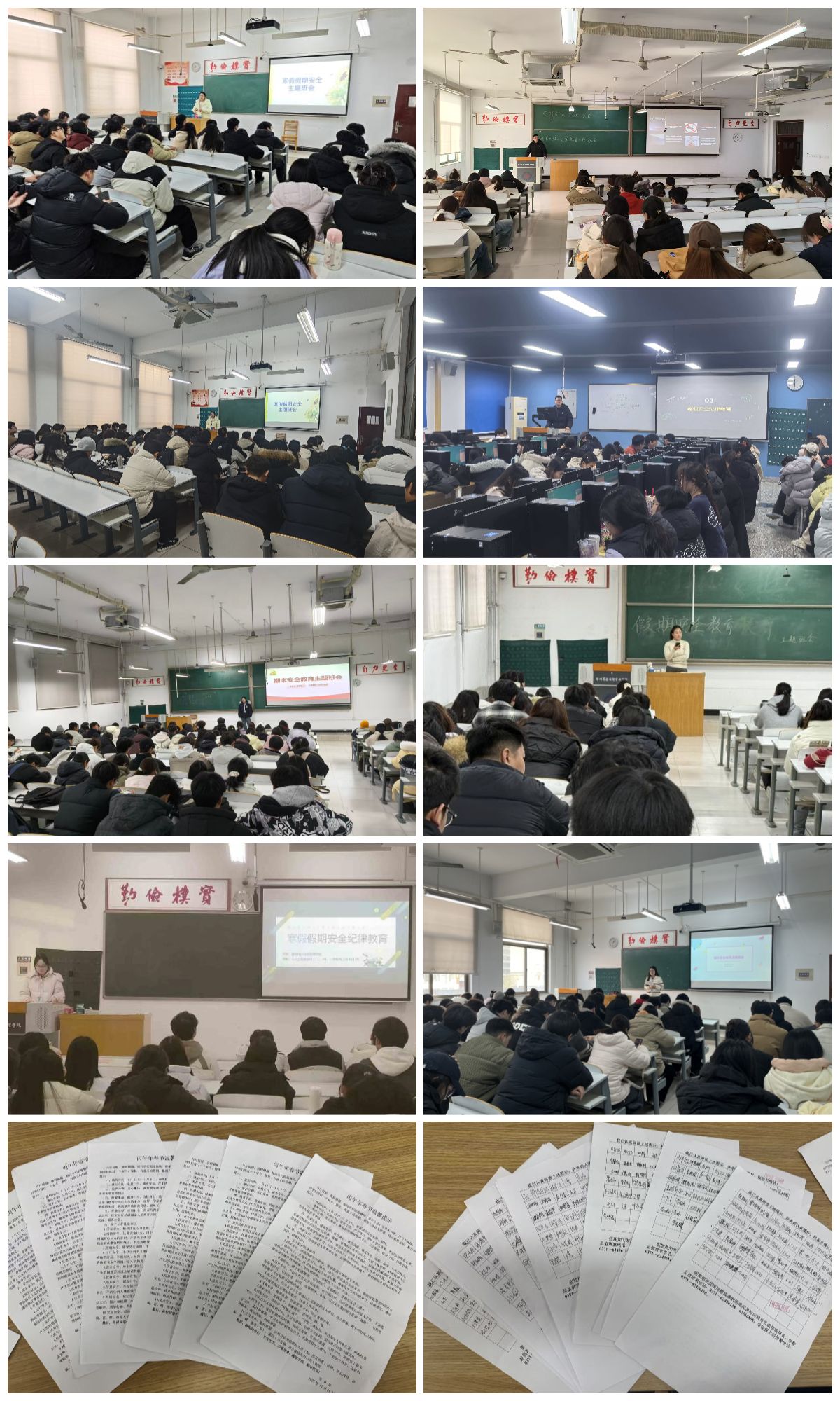 学院高度重视假期学生安全工作,组织各年级、各班级在放假前集中召开了寒假安全教育主题班会。班会上,各班辅导员或班主任系统传达了学校关于寒假放假的具体时间安排,并围绕假期安全与行为规范进行了重点教育。教育内容全面,涵盖了人身安全、财产安全、网络安全等多个维度: