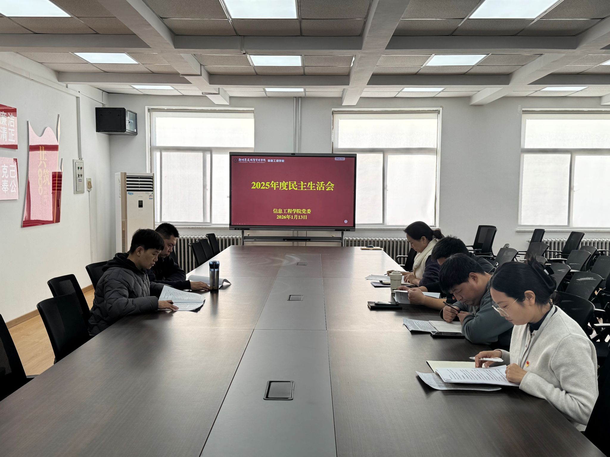 2026年1月13日上午,信息工程学院2025年度党员领导干部民主生活会在商管楼218会议室顺利召开。学院党委书记钟江鸽主持会议,全体党委委员参会。会议紧扣年度民主生活会核心主题,聚焦“五个带头”要求,通过深入查摆问题、坦诚交流思想,凝聚发展共识、明确改进方向。