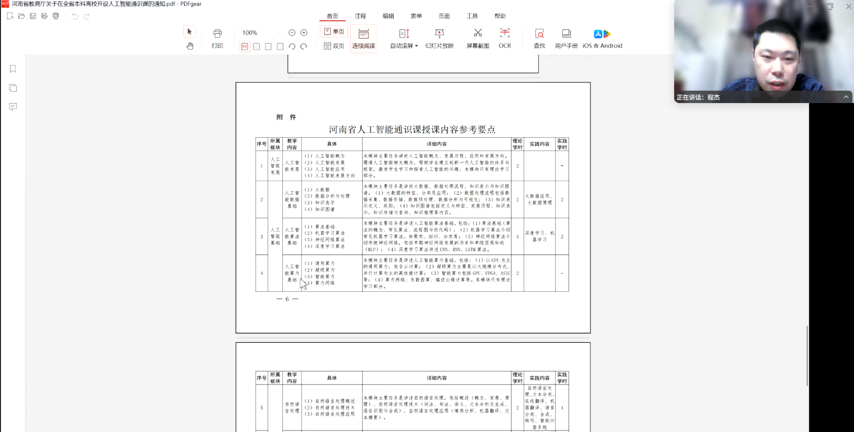 随后,程杰副院长以理工类人工智能通识课程大纲为例,对课程教学内容和要求进行了详细解读。他从课程目标、学时分配、教学重难点、教学方法、考核方式等方面展开,结合自然语言处理、具身智能等核心知识点,明确各章节的教学要求与教学实施方法,强调要立足理工类学生的专业特点,强化理论与实践的结合,通过案例教学、实验训练等方式,帮助学生理解抽象的技术原理,掌握基本的AI工具使用方法。程院长的讲解兼具专业性与实用性,为授课教师精准把握教学大纲、规范教学流程提供了清晰指引。