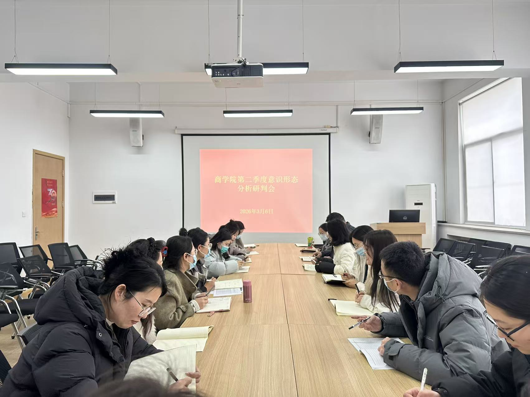 为深入学习贯彻习近平总书记关于意识形态工作的重要论述,全面落实意识形态工作责任制,精准研判当前形势、排查风险隐患,2026年3月6日,商学院召开第一季度意识形态分析研判会。商学院党委书记郭峰主持会议并讲话,党委副书记郗艳花及全体辅导员参会。