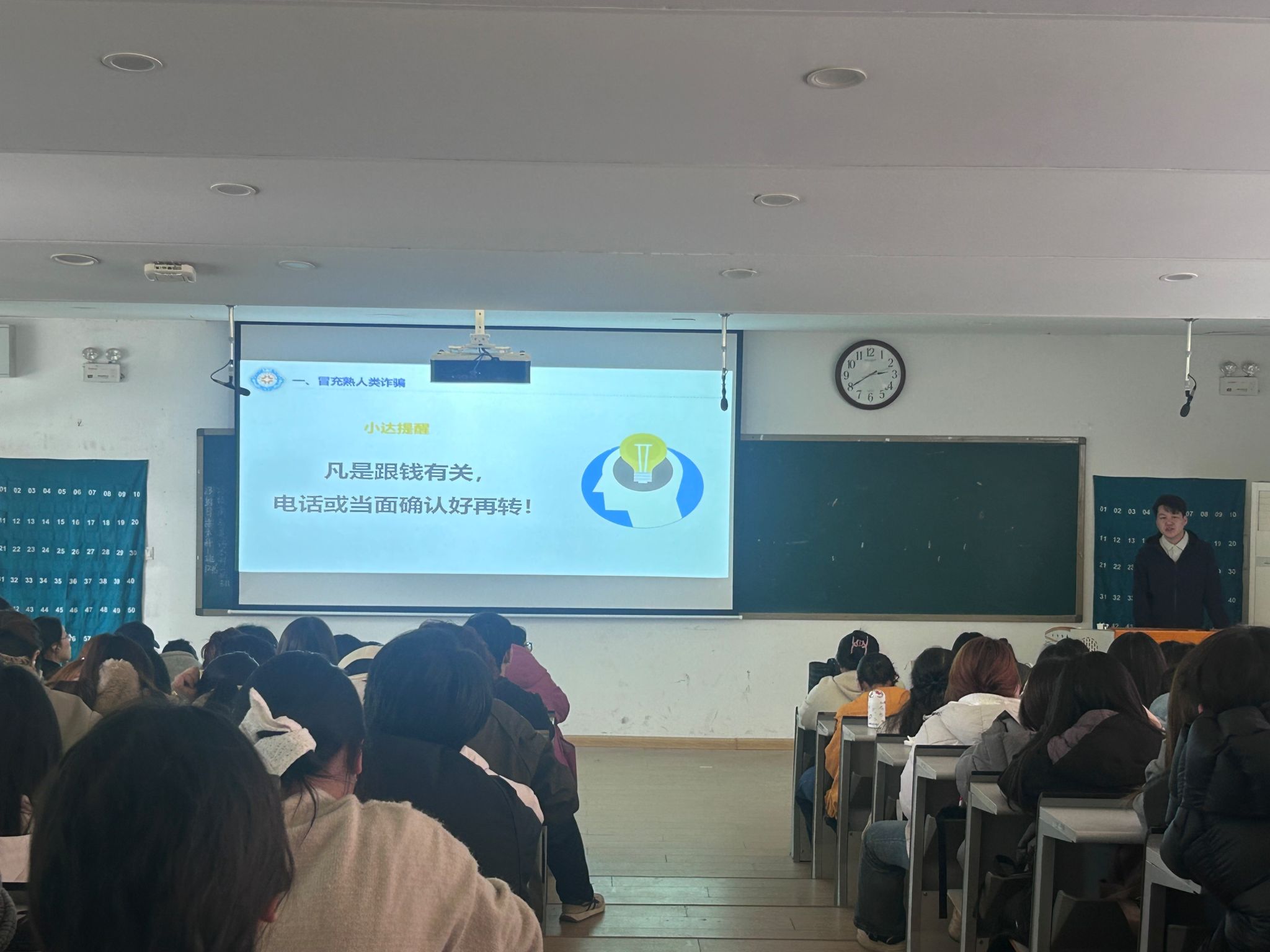 讲座伊始,吴文渊老师围绕电信网络诈骗主题展开宣讲,结合当前诈骗手段翻新迭代的特点,剖析了“冒充熟人类诈骗”“冒充购物客服类诈骗”“兼职刷单返利类诈骗”“网络贷款类诈骗”“游戏装备买卖类诈骗”及“网络交友类诈骗”等典型案例,指出诈骗已突破地域与人群限制;他通过真实案例拆解与情景模拟,详细讲解了诈骗分子利用木马病毒、AI合成技术窃取信息、诱导转账的作案手法,纠正了 “诈骗离自己很远”“只有傻子才会被骗”的认知误区,提醒师生务必提高警惕,做到“不轻信、不透露、不转账”,遇到可疑情况及时向学校保卫科或警方求助。
