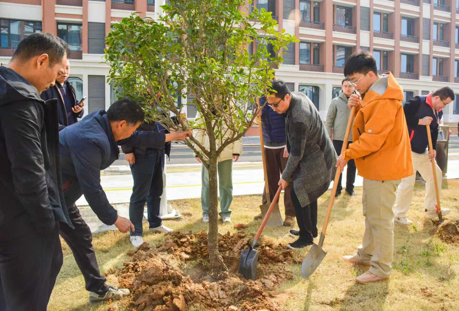 随后,全体党员前往校园绿化区域开展义务植树活动。大家分工协作、规范操作,严格按照技术要求完成挥锹铲土、扶苗填坑、提水浇灌等工序,历时半小时,为校区种下一片“党建林”,为校园增添了新的生机与活力。