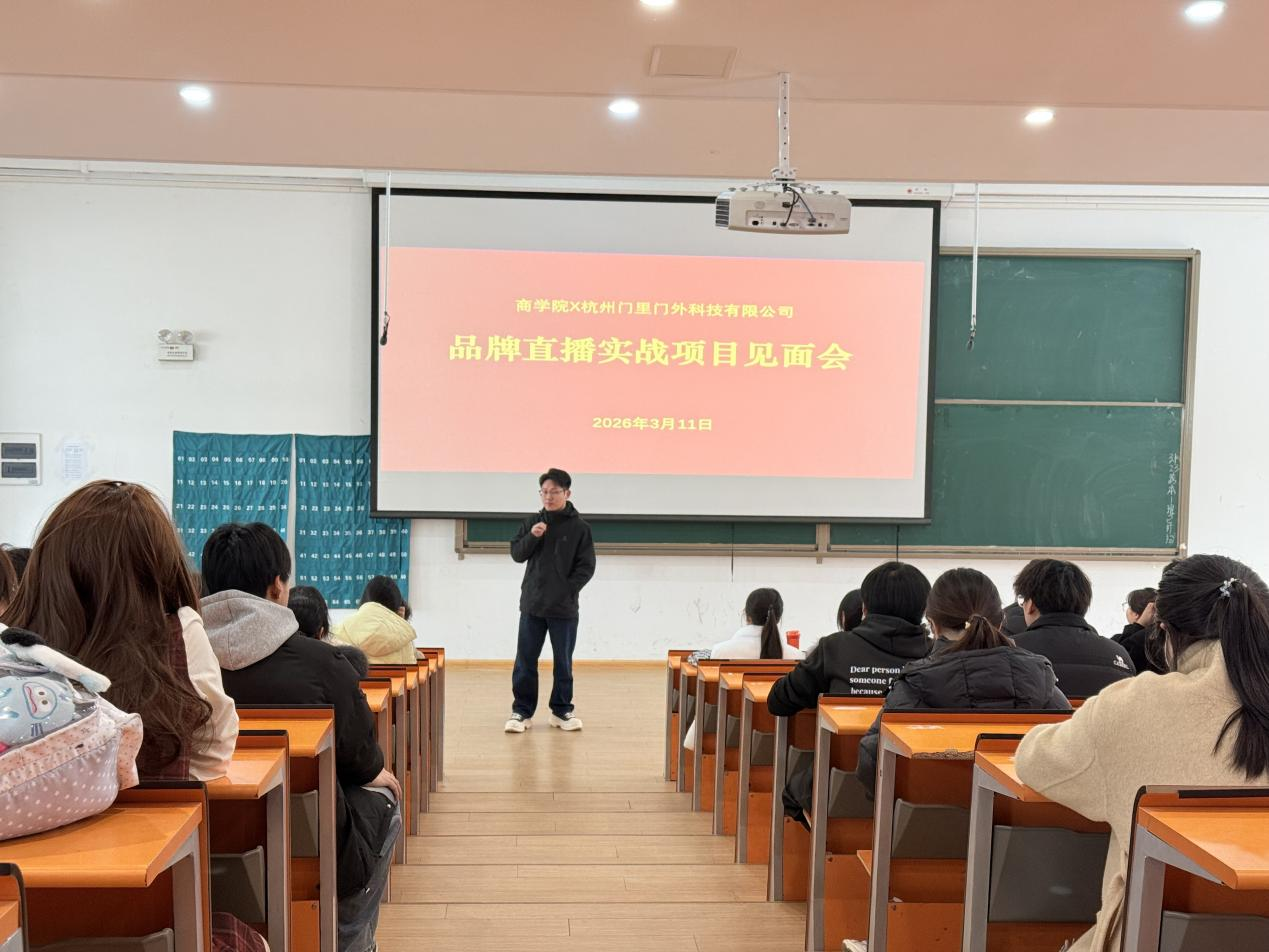 为落实校企合作共识,推动品牌直播项目落地,3月11日中午,商学院品牌直播实战项目见面会在教学楼2号楼116教室如期举行。本次见面会面向前期已报名及现场有意向加入的同学,旨在帮助大家全面了解项目详情并进行现场答疑。杭州门里门外科技有限公司直播项目负责人黄如男,两位驻校负责人刘红果与叶浩远,商学院产学研专员刘玲芳、产业学院教师刘广成、卢瑞娜共同出席见面会。
