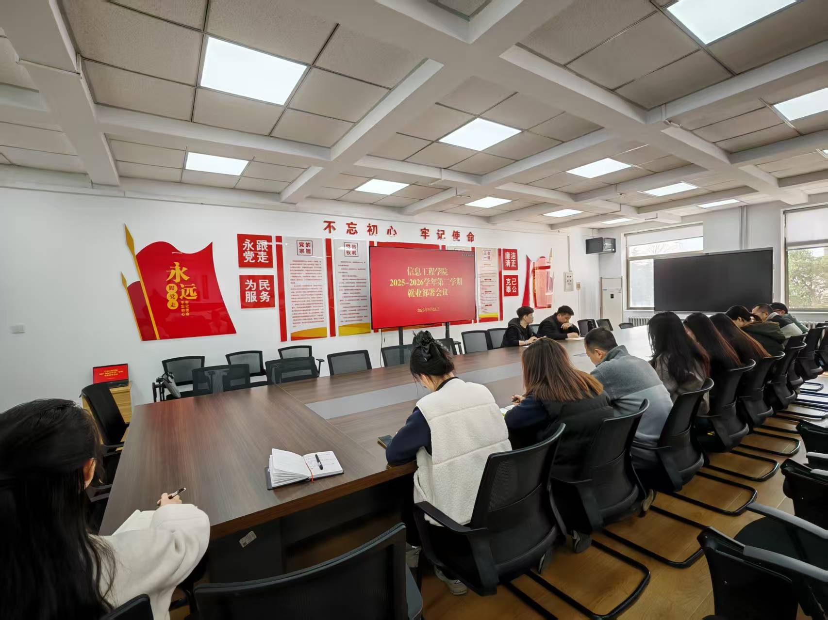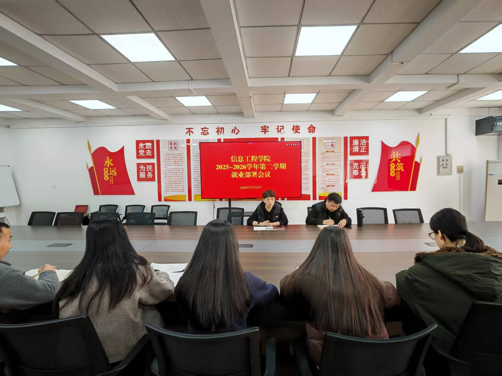 为深入贯彻落实2026届全国高校毕业生就业创业工作会议精神,抢抓春季招聘黄金期,推动毕业生更充分、更高质量就业,3月13日,信息工程学院于商-218会议室召开2025-2026学年第二学期就业工作部署会议。学院党委书记钟江鸽、党委副书记王崇出席会议,全体毕业班辅导员参加会议。