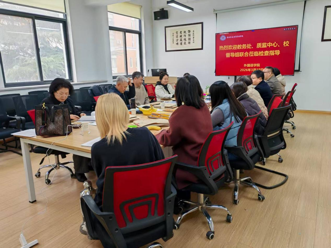 3月18日下午,由校督导及文平教授、张茂松教授、郑跃丽教授、聂轶娉老师和教务处丁浥尘老师一行5人组成的学校期初教学检查专家组莅临外国语学院进行期初教学检查工作。外国语学院院长王莉莉教授、副院长贺光辉教授、教学秘书祁胜利老师、各教研室主任及教师代表参加了本次检查工作。