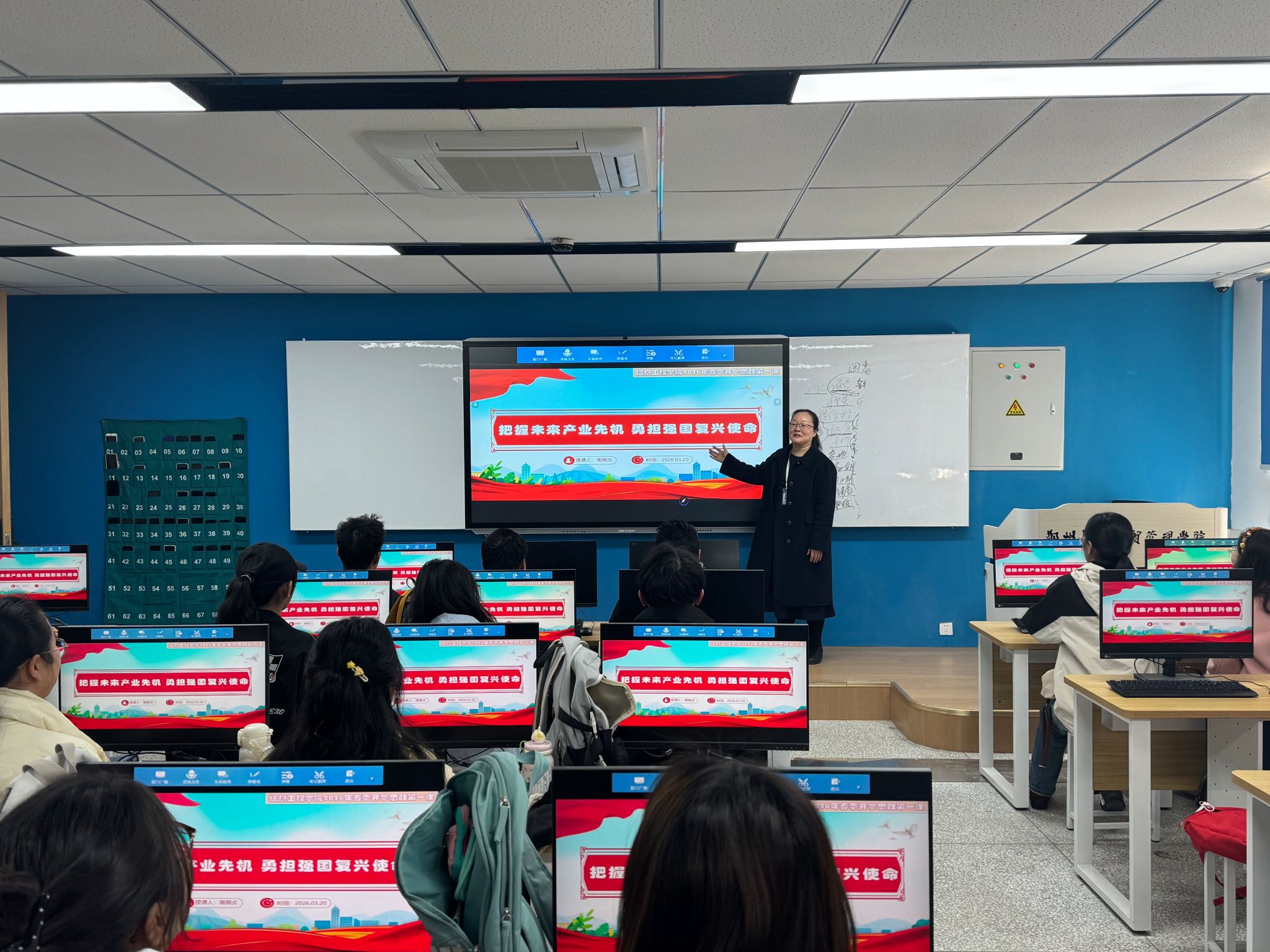 2026年3月20日上午,信息工程学院院长周湘贞走进课堂,为2025级软件工程专升本4班全体学生讲授2026年春季学期开学思政第一课。本次课程以《把握未来产业先机 勇担强国复兴使命》为题,深入落实立德树人根本任务,紧扣国家发展战略与青年成长成才主线,为同学们带来了一堂思想深刻、贴合专业的思政教育课。