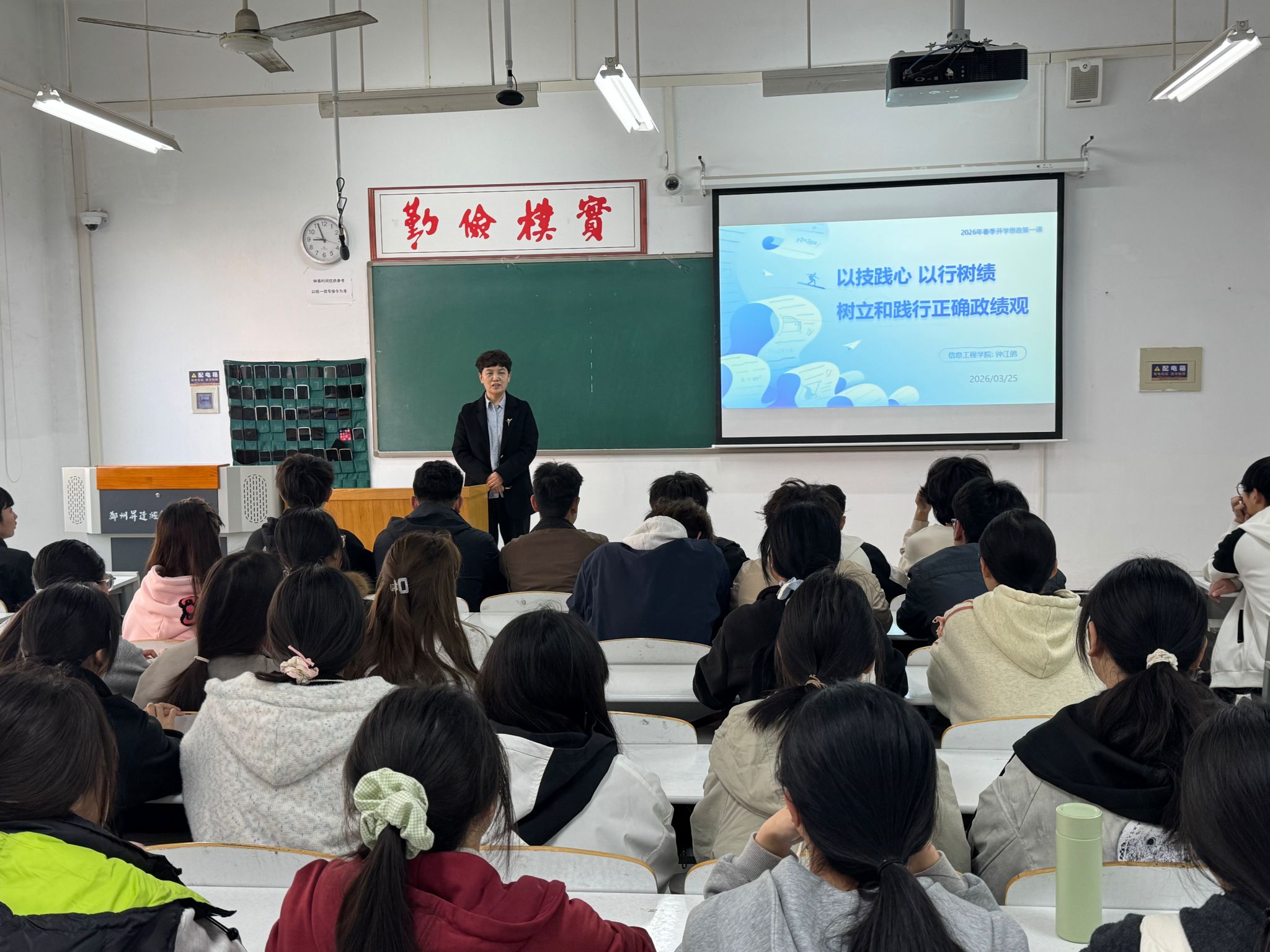 2026年3月25日上午,信息工程学院党委书记钟江鸽为2025级物联网本科2班全体学生讲授2026年春季学期开学思政第一课,课程以《以技践心 以行树绩,树立和践行正确政绩观》为题,引导青年学子筑牢思想根基、明确成长方向。