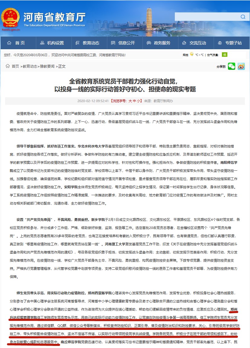 2020年2月12日,河南省教育厅官方网站豫教要闻栏目发布题为《全省教育系统党员干部着力强化行动自觉,以投身一线的实际行动答好守初心、担使命的现实考题》的综合文章一篇,介绍面对严峻复杂的疫情,全省教育系统的广大党员认真学习贯彻习近平总书记重要讲话和重要指示精神,坚决贯彻党中央、国务院和省委、省政府关于疫情防控工作的系列部署,上下一心,迅速行动,各级基层党组织战斗在一线,广大党员干部奋斗在一线,充分发挥战斗堡垒作用和先锋模范作用,全力打响全省教育系统疫情防控攻坚战的先进做法。其中报道了我校在该项工作中的典型做法。现将原文摘录如下: