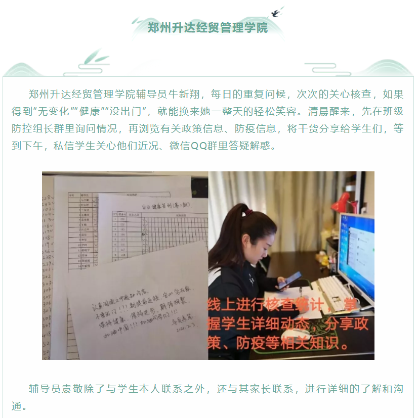 郑州升达经贸管理学院辅导员牛新翔,每日的重复问候,次次的关心核查,如果得到“无变化”“健康”“没出门”,就能换来她一整天的轻松笑容。清晨醒来,先在班级防控组长群里询问情况,再浏览有关政策信息、防疫信息,将干货分享给学生们,等到下午,私信学生关心他们近况、微信QQ群里答疑解惑。