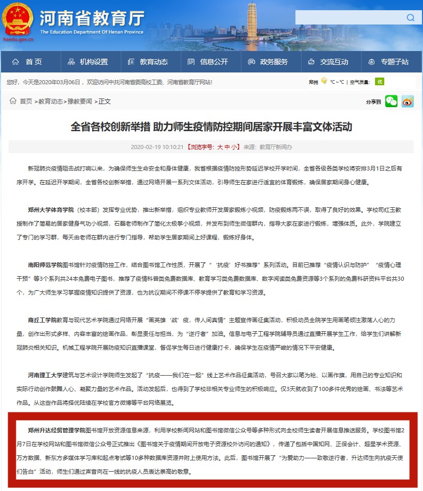 郑州升达经贸管理学院图书馆开放资源信息来源,利用学校新闻网站和图书馆微信公众号等多种形式向全校师生读者开展信息推送服务。学校图书馆2月7日在学校网站和图书馆微信公众号正式推出《图书馆关于疫情期间开放电子资源校外访问的通知》,传递了包括中国知网、正保会计、超星学术资源、万方数据、新东方多媒体学习库和起点考试等10多种数据库资源并附上使用方法。此后,图书馆开展了“为爱助力——致敬逆行者,升达师生向抗疫天使们告白”活动,师生们通过声音向在一线的抗疫人员表达崇高的敬意。