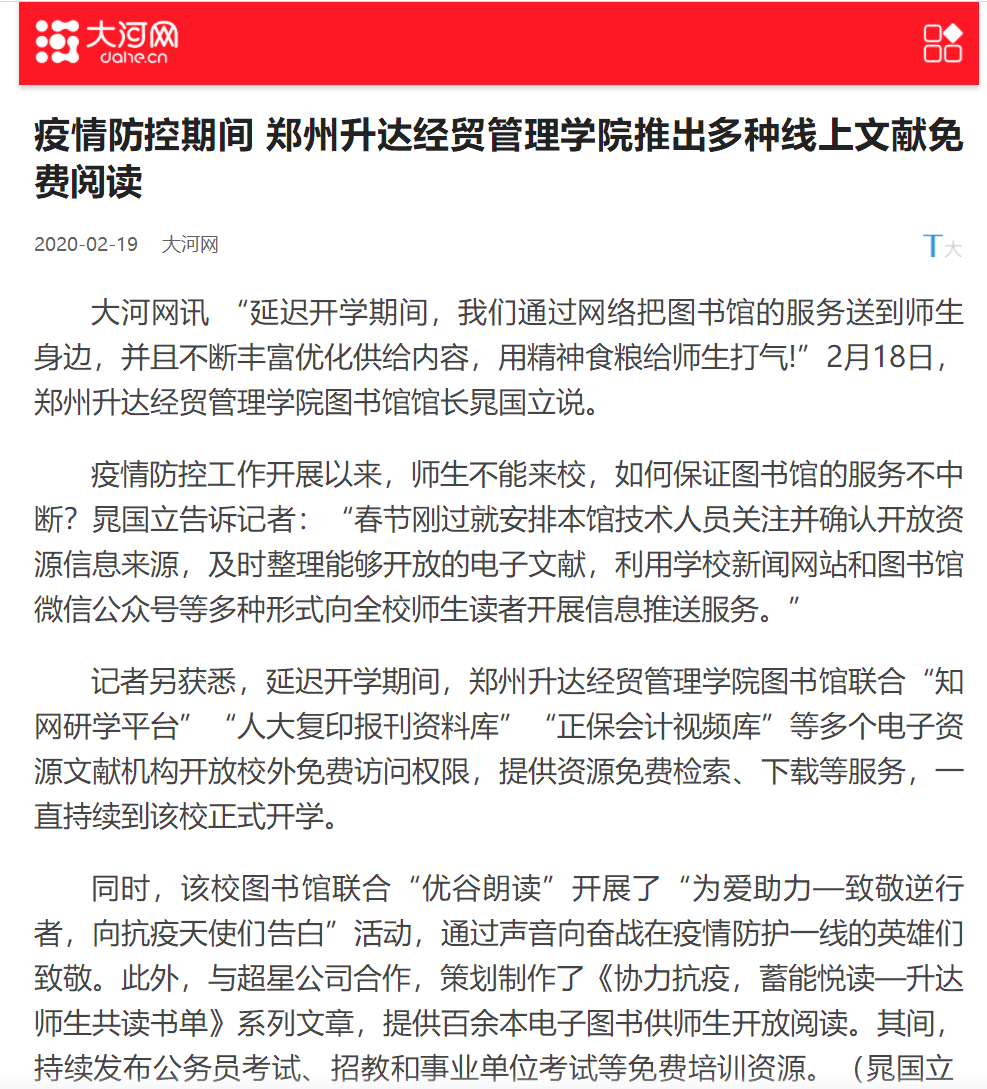 2020年2月19日,大河网以《河南高校:为守你平安,为等你归来……他们坚守阵地战“疫”,保卫校园防“疫”》为题,报道了我校因新冠肺炎疫情延迟开学期间,通过网络把图书馆的服务送到师生身边,并且不断丰富优化供给内容,用精神食粮给师生打气的做法。现将原文摘录如下: