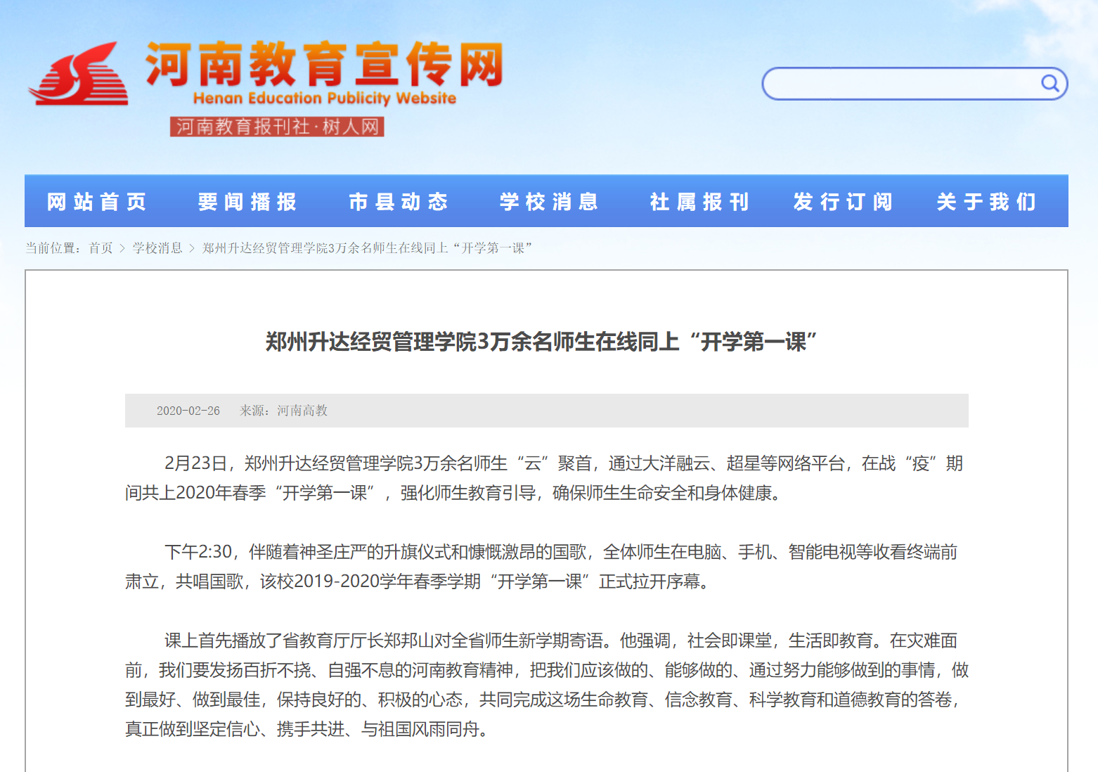 2020年2月26日,河南教育宣传网以《郑州升达经贸管理学院3万余名师生在线同上“开学第一课”》为题,报道了我校3万余名师生“云”聚首,通过大洋融云、超星等网络平台,在战“疫”期间共上2020年春季“开学第一课”,强化师生教育引导,确保师生生命安全和身体健康。现将原文摘录如下: