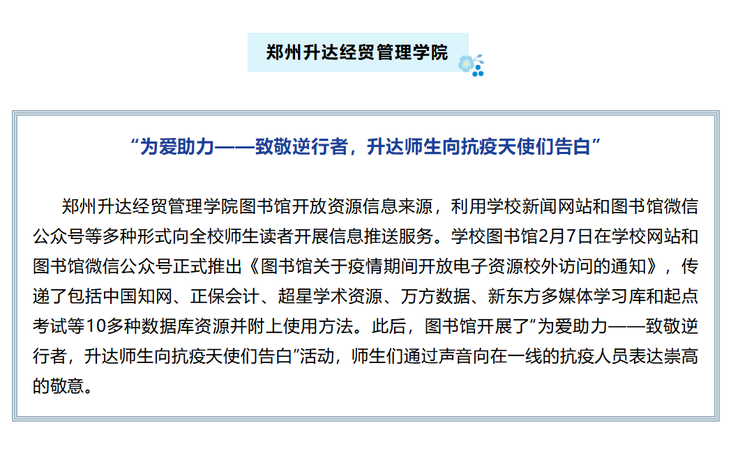 郑州升达经贸管理学院图书馆开放资源信息来源,利用学校新闻网站和图书馆微信公众号等多种形式向全校师生读者开展信息推送服务。学校图书馆2月7日在学校网站和图书馆微信公众号正式推出《图书馆关于疫情期间开放电子资源校外访问的通知》,传递了包括中国知网、正保会计、超星学术资源、万方数据、新东方多媒体学习库和起点考试等10多种数据库资源并附上使用方法。此后,图书馆开展了“为爱助力——致敬逆行者,升达师生向抗疫天使们告白”活动,师生们通过声音向在一线的抗疫人员表达崇高的敬意。