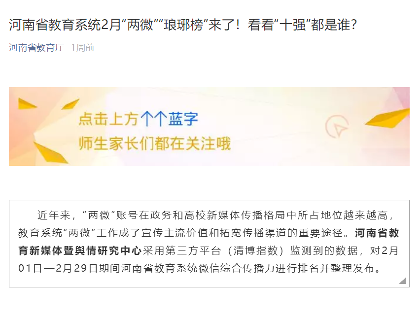 近年来,“两微”账号在政务和高校新媒体传播格局中所占地位越来越高,教育系统“两微”工作成了宣传主流价值和拓宽传播渠道的重要途径。2020年3月5日,河南省教育新媒体暨舆情研究中心采用第三方平台(清博指数)监测到的数据,对2月01日—2月29日期间河南省教育系统微信综合传播力进行排名并整理发布于河南省教育厅官方微信公众号题为《河南省教育系统2月“两微”“琅琊榜”来了!看看“十强”都是谁?》的推文中。