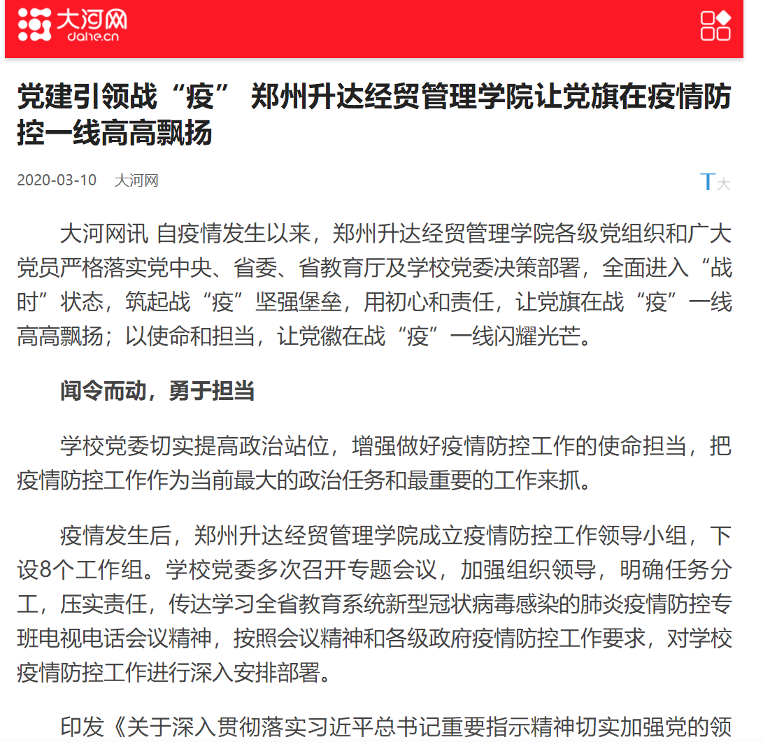 2020年3月10日,大河网以《党建引领战“疫” 郑州升达经贸管理学院让党旗在疫情防控一线高高飘扬》为题,报道了我校院各级党组织和广大党员严格落实党中央、省委、省教育厅及学校党委决策部署,全面进入“战时”状态,筑起战“疫”坚强堡垒,用初心和责任,让党旗在战“疫”一线高高飘扬;以使命和担当,让党徽在战“疫”一线闪耀光芒的一系列举措。现将原文摘录如下: