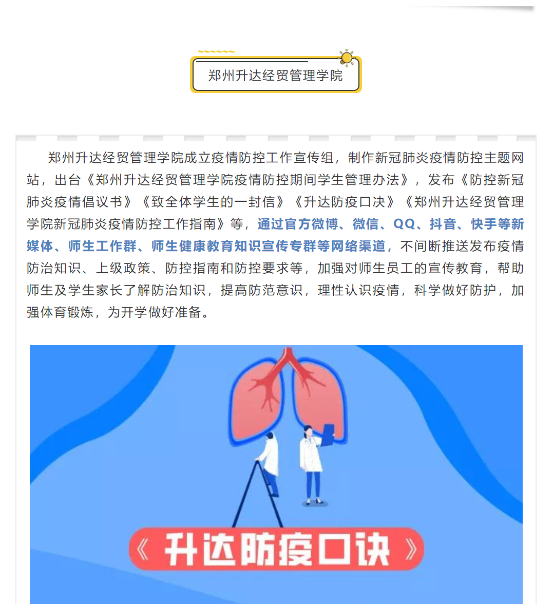 郑州升达经贸管理学院成立疫情防控工作宣传组,制作新冠肺炎疫情防控主题网站,出台《郑州升达经贸管理学院疫情防控期间学生管理办法》,发布《防控新冠肺炎疫情倡议书》《致全体学生的一封信》《升达防疫口决》《郑州升达经贸管理学院新冠肺炎疫情防控工作指南》等,通过官方微博、微信、QQ、抖音、快手等新媒体、师生工作群、师生健康教育知识宣传专群等网络渠道,不间断推送发布疫情防治知识、上级政策、防控指南和防控要求等,加强对师生员工的宣传教育,帮助师生及学生家长了解防治知识,提高防范意识,理性认识疫情,科学做好防护,加强体育锻炼,为开学做好准备。