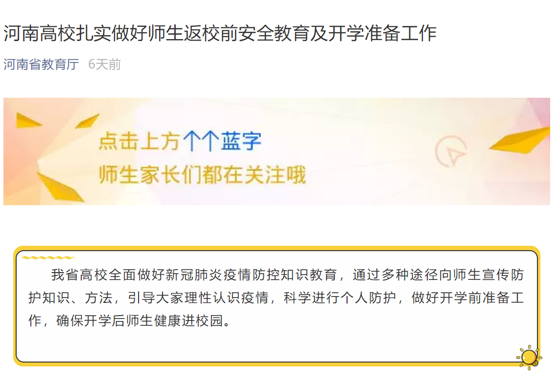 2020年3月13日,河南省教育厅官方微信公众号发布以《河南高校扎实做好师生返校前安全教育及开学准备工作》为题的推文,报道我省高校全面做好新冠肺炎疫情防控知识教育,通过多种途径向师生宣传防护知识、方法,引导大家理性认识疫情,科学进行个人防护,做好开学前准备工作,确保开学后师生健康进校园。其中,选取了我校在该项工作中的典型做法。现将原文摘录如下: