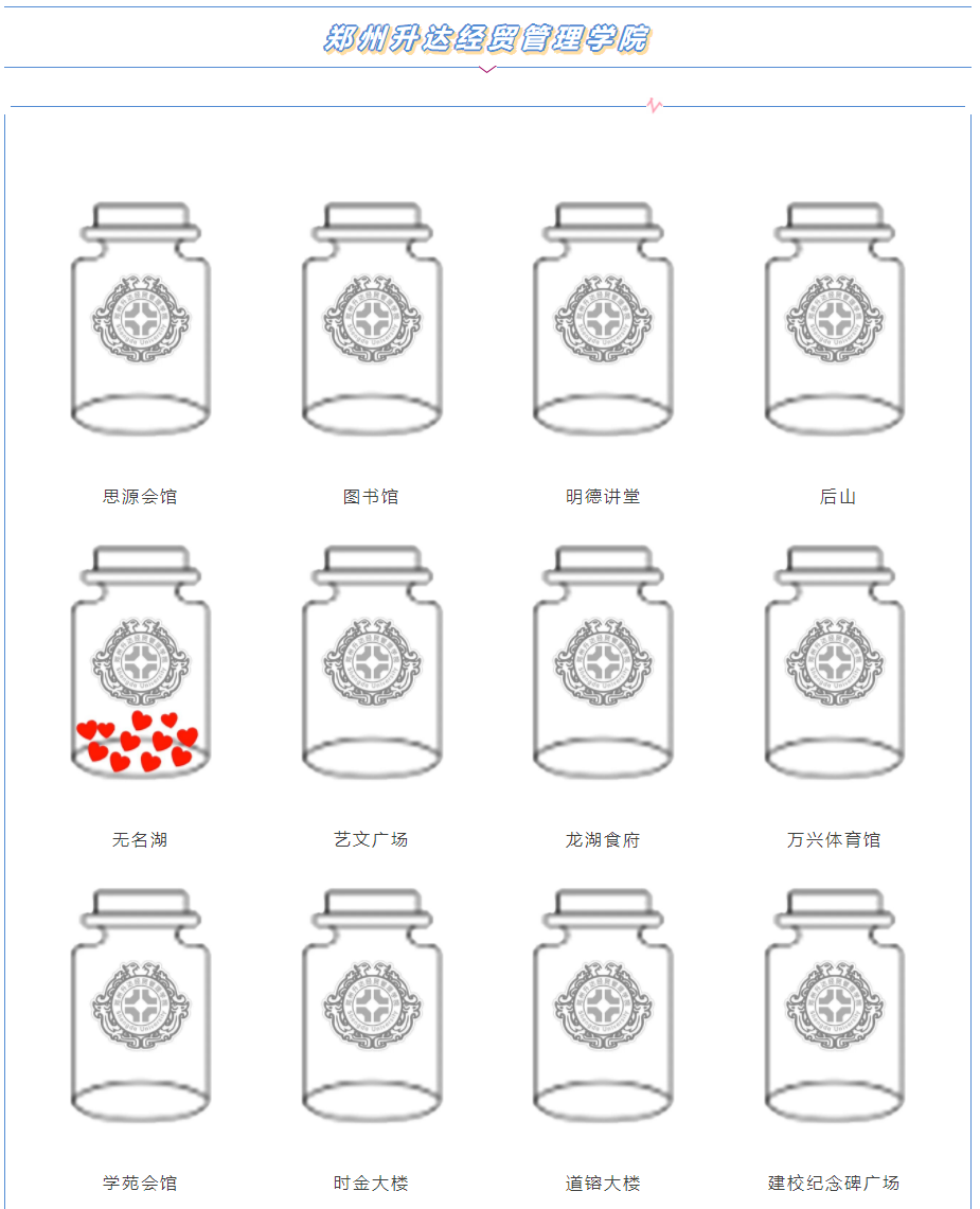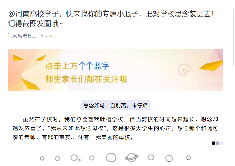 2020年3月14日,河南省教育厅官方微信公众号发布以《@河南高校学子,快来找你的专属小瓶子,把对学校思念装进去!记得截图发圈哦~》为题的推文,通过收集学子对于学校的思念来展现部分高校的美景,现将原文摘录如下: