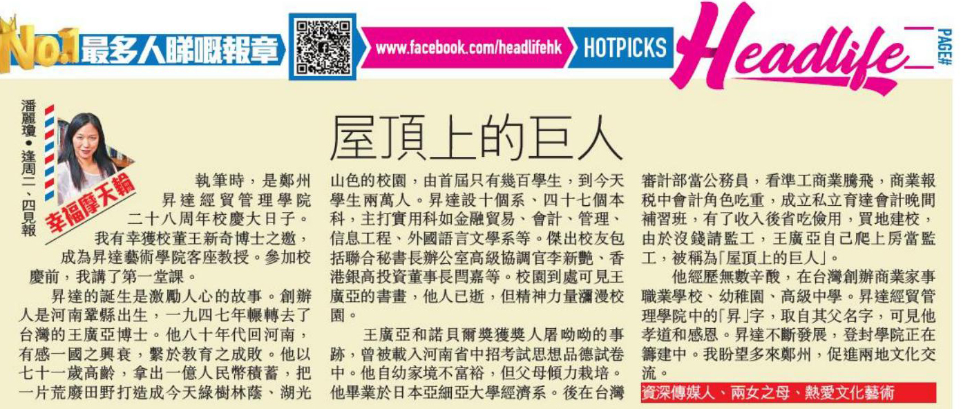 升达的诞生是激励人心的故事。创办人是河南巩县出生,一九四七年辗转去了台湾的王广亚博士。他八十年代回河南,有感一国之兴衰,系于教育之成败。他以七十一岁高龄,拿出一亿人民币积蓄,把一片荒废田野打造成今天绿树林荫、湖光山色的校园,由首届只有几百学生,到今天学生两万人。升达设十个系、四十七个本科,主打实用科如金融贸易、会计、管理、信息工程、外国语言文学系等。杰出校友包括联合国秘书长办公室高级协调官李新艳、香港银高投资董事长闫嘉等。校园到处可见王广亚的书画,他人已逝,但精神力量弥漫校园。