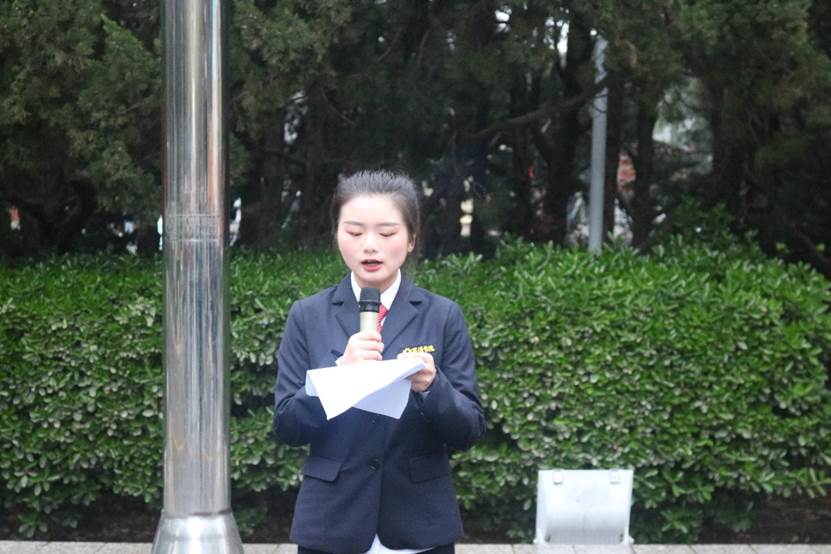 随后,由2018级团员代表邵玉姣在国旗下演讲,她呼吁我们不忘初心、牢记使命,以更加昂扬的精神状态步入新时代,为实现中国梦添砖加瓦。