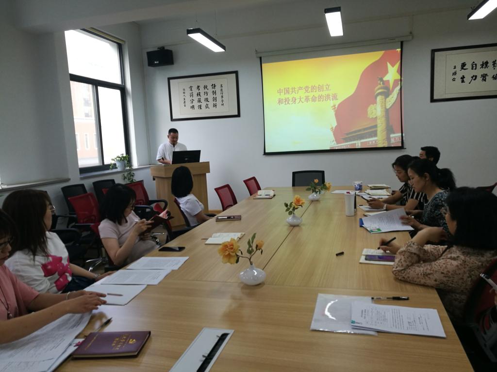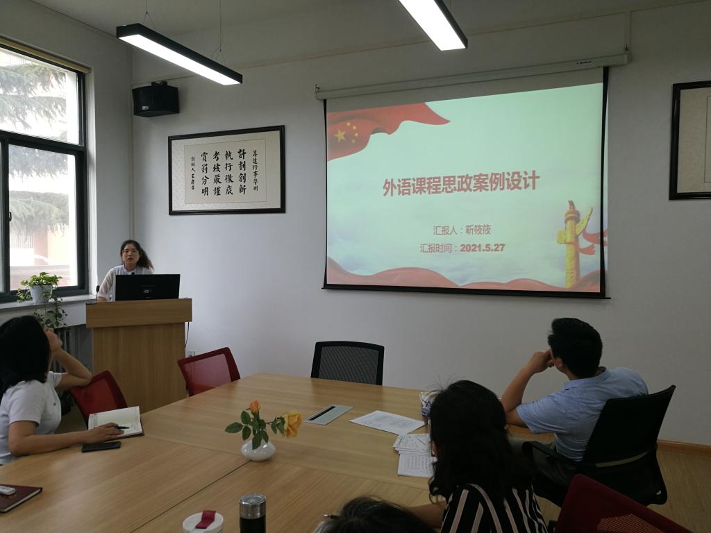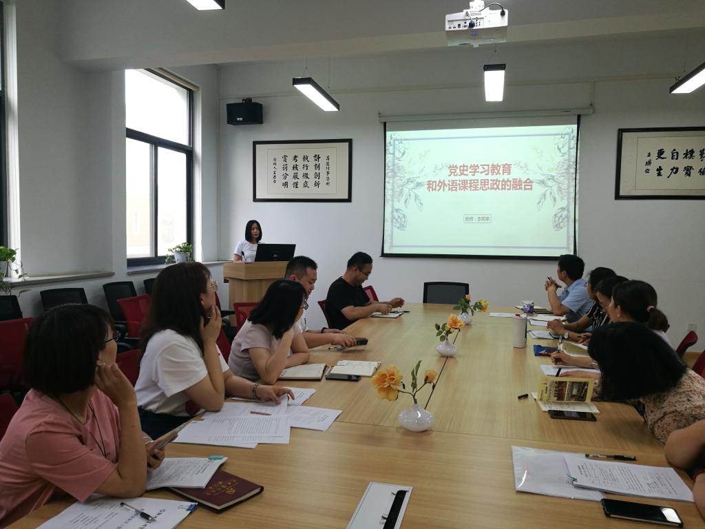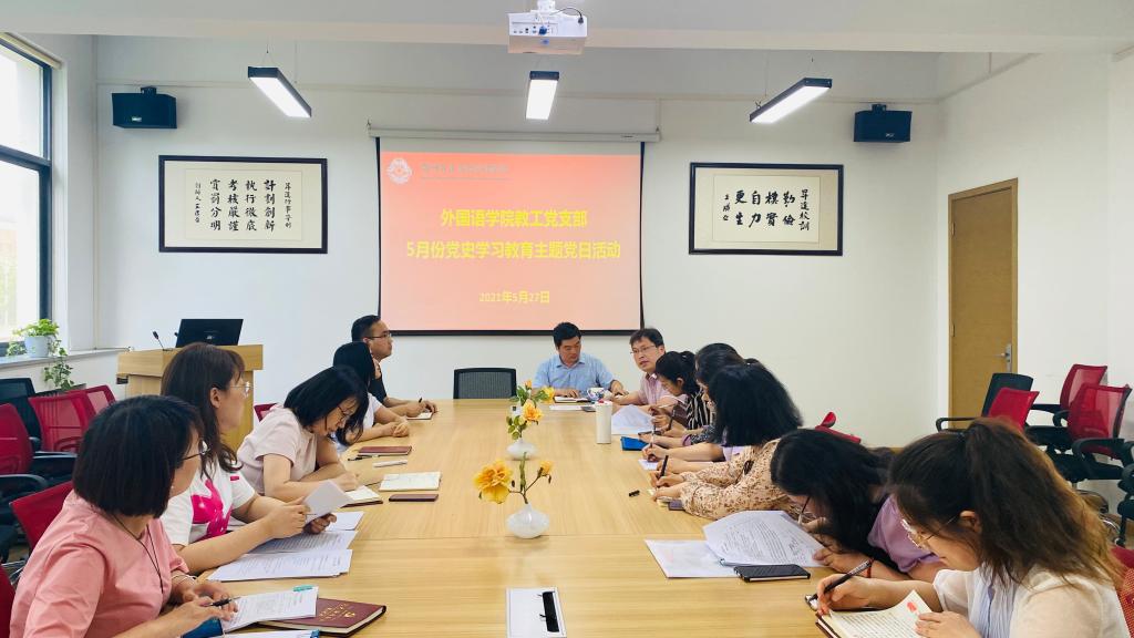4月27日下午,外国语学院全体教工党员在教学1号楼205会议室开展5月份主题党日活动,主题为“党史学习教育与外语课程思政”。会议由支部书记张保培同志主持,李笑寒、高保欣、靳筱筱三位老师就党史学习教育感悟与外语课程思政案例设计做分享交流。