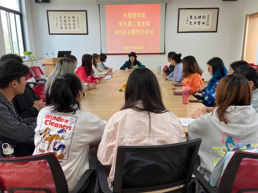 为庆祝建党100周年,在广大党员中大力弘扬爱国主义精神,增强党史、国史教育,学习先进党员事迹、精神,响应国家号召,4月28日中午12:00,外国语学院学生第二党支部在一号楼206会议室召开4月份主题党日活动,学生大二党支部书记邢璐欣同志主持本次会议,会议主要围绕“学百年党史”,举办“我为优秀共产党员代言”活动。深入了解学习党员的光辉事迹,学习优良精神。