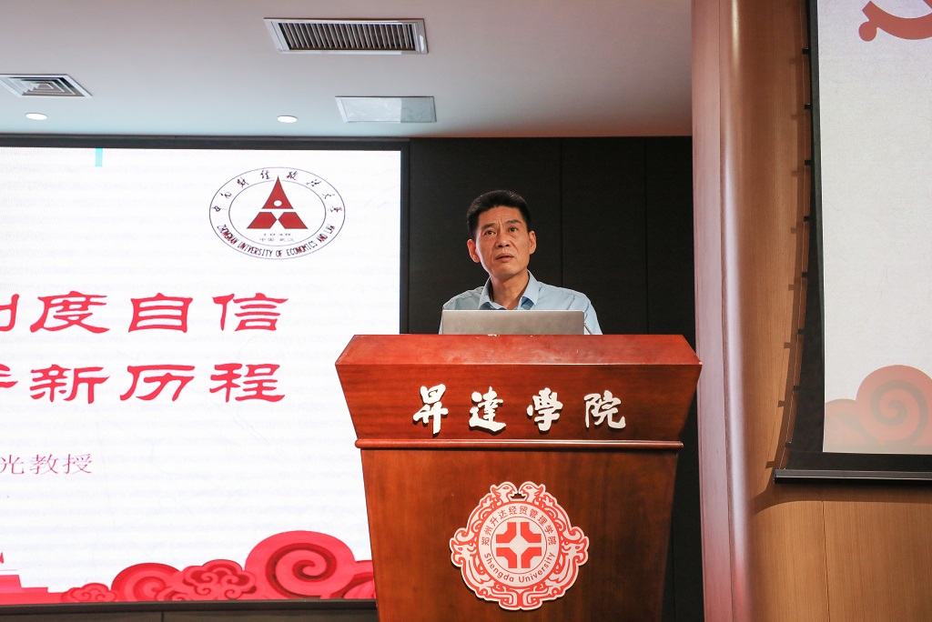 6月11日下午,中原大讲堂“不忘初心 坚定制度自信,牢记使命 开辟崭新历程”主题讲座在我校双创大讲堂举行。本次讲座由郑州市社科联主办,郑州市民办教育史展馆承办,中南财经政法大学教授、当代青年学者、作家、诗人、中国作家协会会员程韬光主讲,众多学生到场听讲。讲座由文法学院副院长赵严俊主持。