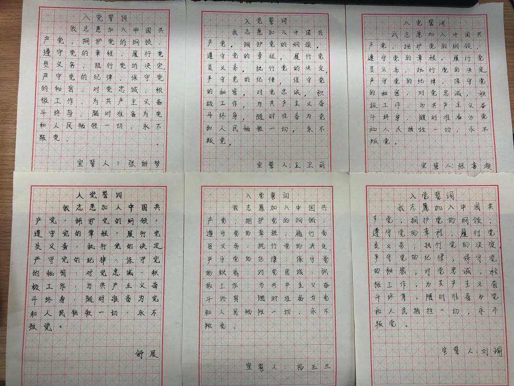 “我志愿加入中国共产党,拥护党的纲领,遵守党的章程……”在党员们认真郑重的书写下,入党誓词在笔尖流淌,在纸上跳动,既庄重又热烈,鲜活于党员炽热的胸膛之上。短短80个字和12个标点符号,党员们用了十多分钟才抄写完毕,在审核的同时再次领悟入党誓词中的一字一句,入心、入脑,牢固为共产主义事业而奋斗的理想信念。