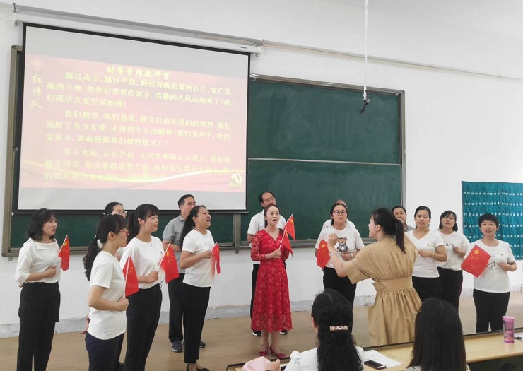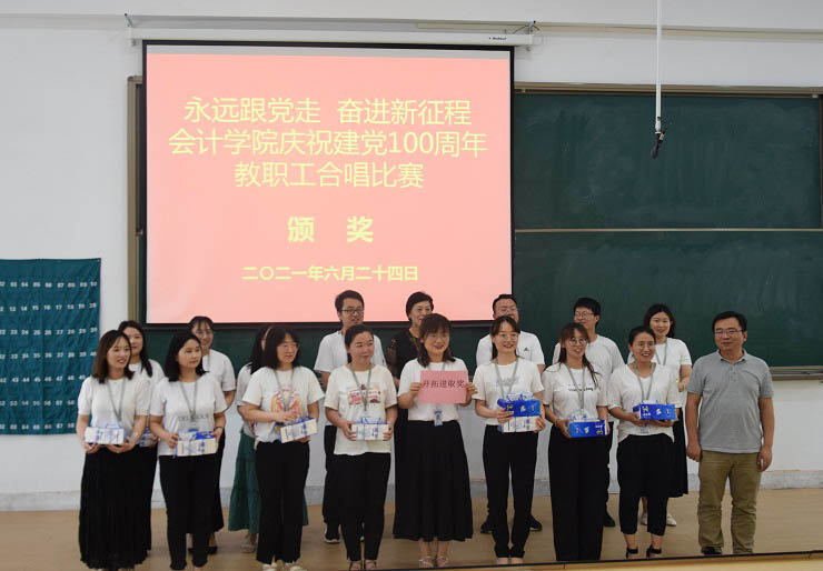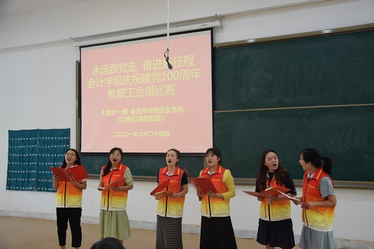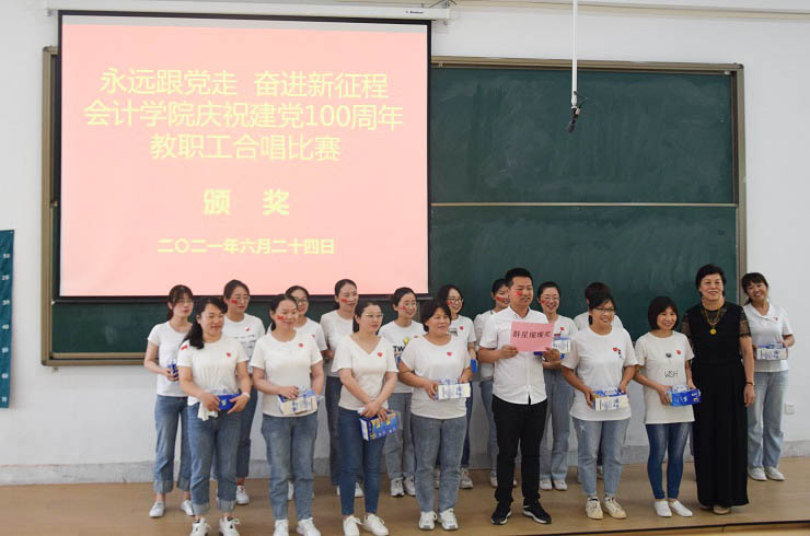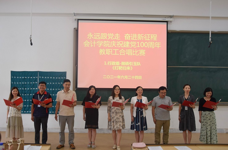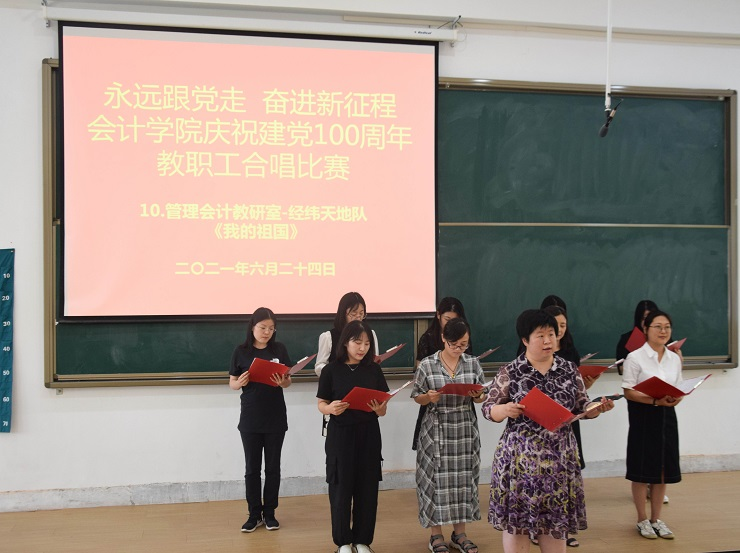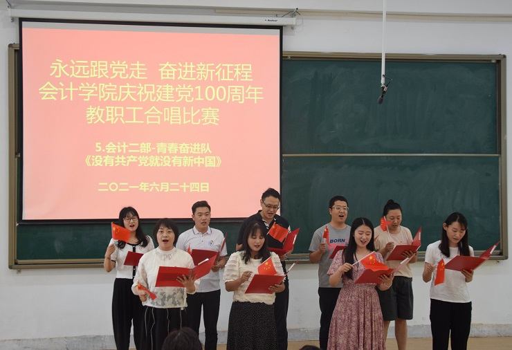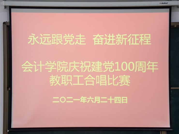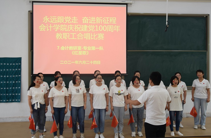 为热烈庆祝中国共产党成立100周年,进一步丰富教职工文化生活,全面展示新时代会计学院教职工的新气象,会计学院工会于6月24日下午在教学四号楼118教室举办了“永远跟党走奋进新征程”庆祝建党100周年教职工合唱比赛。比赛由会计学院行政秘书兼团委书记、工会主席陈刚老师主持,全院教职工热情高涨、精心准备,积极组队参加了比赛。