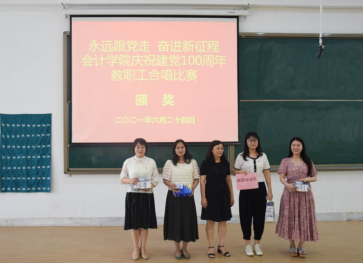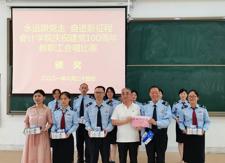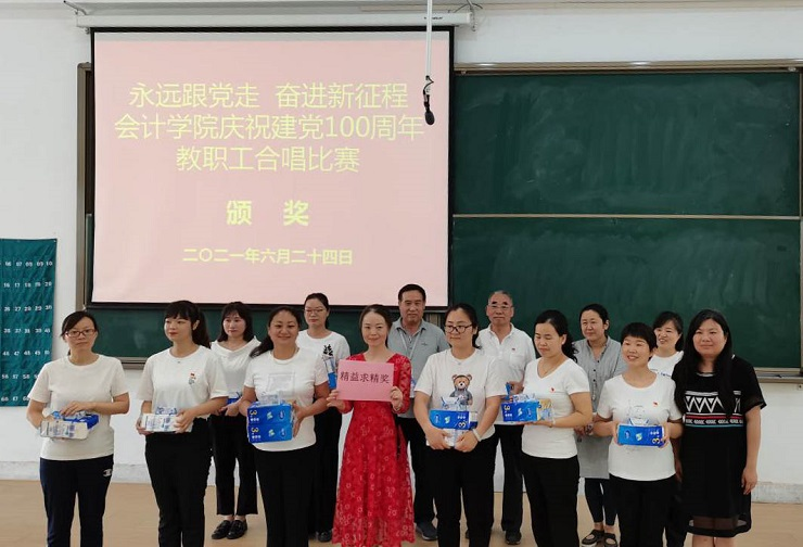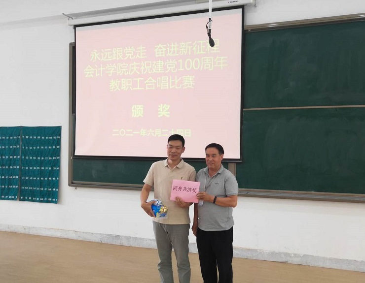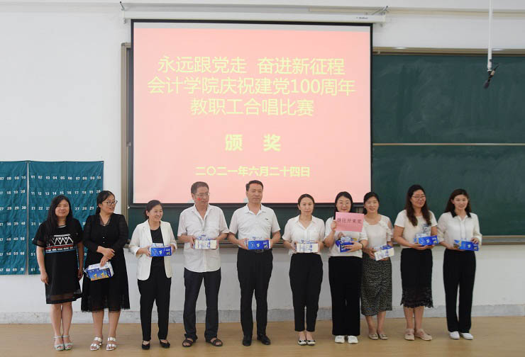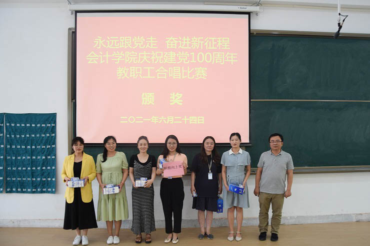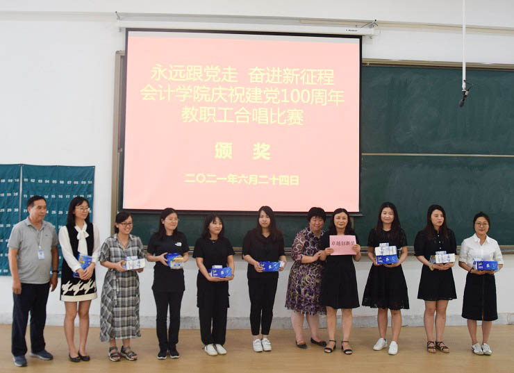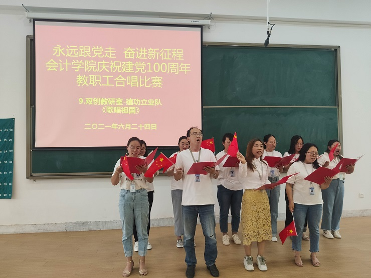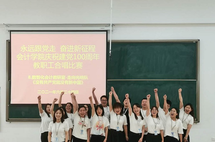 为热烈庆祝中国共产党成立100周年,进一步丰富教职工文化生活,全面展示新时代会计学院教职工的新气象,会计学院工会于6月24日下午在教学四号楼118教室举办了“永远跟党走奋进新征程”庆祝建党100周年教职工合唱比赛。比赛由会计学院行政秘书兼团委书记、工会主席陈刚老师主持,全院教职工热情高涨、精心准备,积极组队参加了比赛。