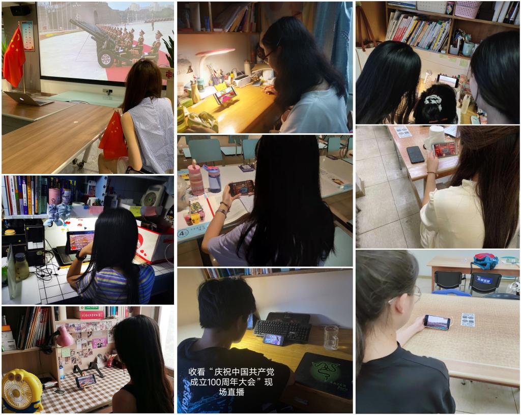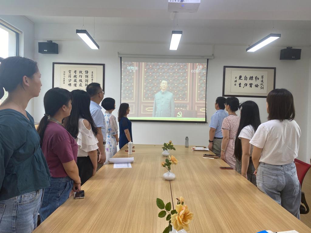 江河万里,七月的丰碑耸立不朽,神州大地,一百年的党史辉煌灿烂。7月1日上午8时,庆祝中国共产党成立100周年大会在北京天安门广场隆重举行。中共中央总书记、国家主席、中央军委主席习近平出席大会并发表重要讲话。外国语学院党委组织学院没有监考任务的教职工在教一楼206会议室集中收听收看直播实况,没有考试任务的学生也通过各种途径收听收看大会直播并开展交流研讨活动。