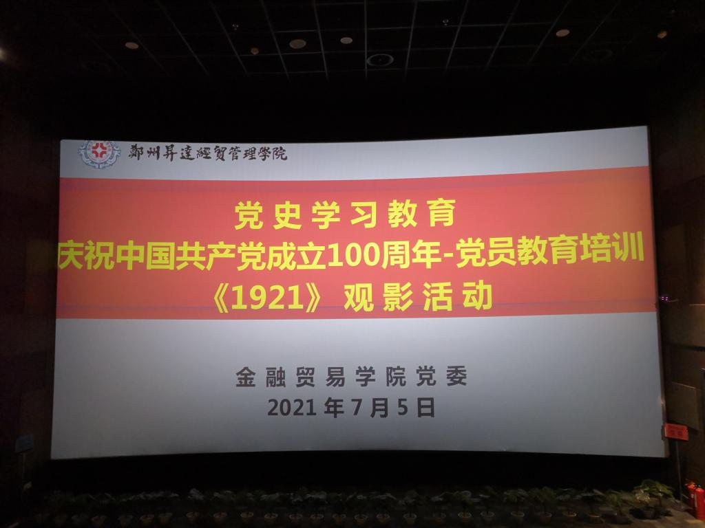 按照学院党史学习教育工作安排,庆祝中国共产党成立100周年之际,全面激活学院教工党员党性修养,落实好党员教育培训工作,金融贸易学院党委于7月5日下午在奥斯卡金时代影城组织学院教工党员开展党史学习教育暨庆祝中国共产党成立100周年——党员教育培训《1921》观影。