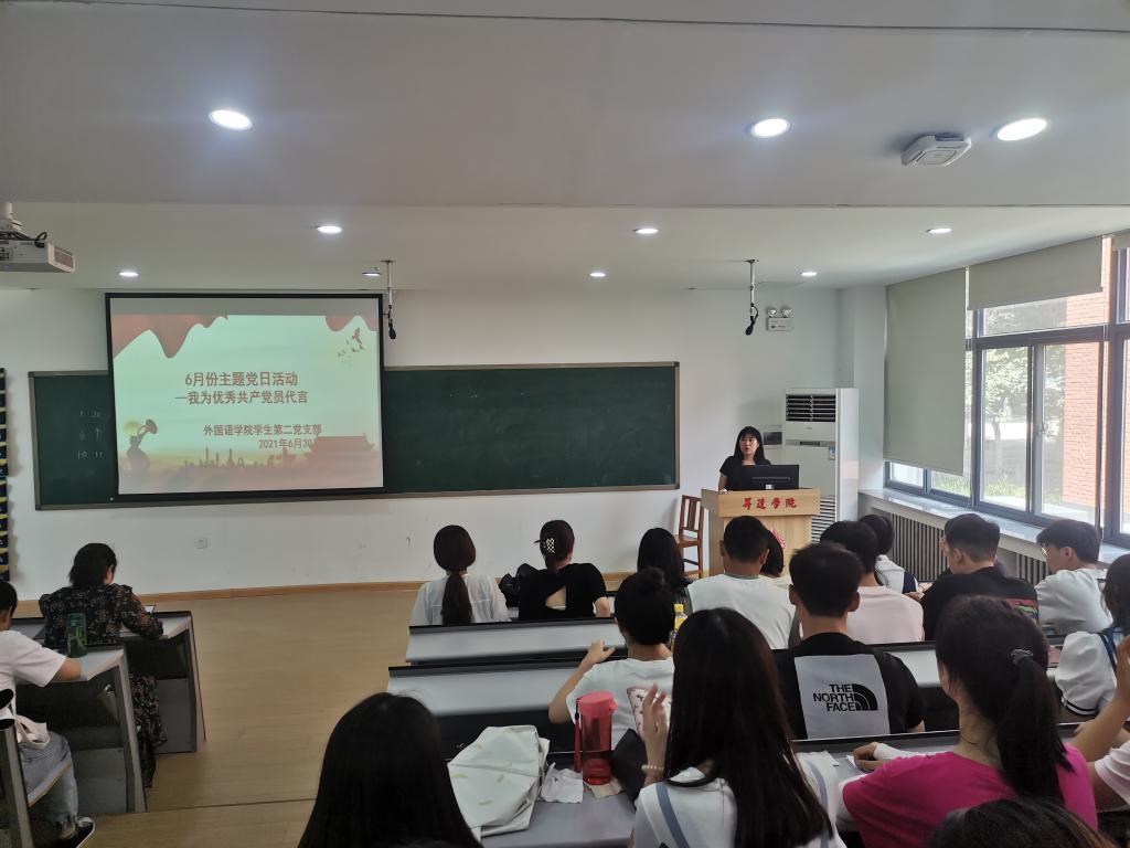2021年7月1日是中国共产党成立100周年纪念日,在这个具有伟大纪念意义的日子来临前。为更好学习了解党史及英雄的光辉历史,发扬革命先烈精神,外国语学院学生第二党支部全体党员同志于2021年6月30日在教学一号楼109教室举行了6月份支部主题党日活动,活动以党史学习教育为主题,开展第二期“我为优秀共产党员代言”交流分享。会议由支部书记邢璐欣老师主持,全体党员参加。