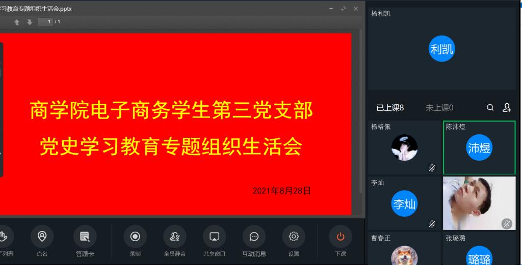 为认真贯彻“学史明理、学史增信、学史崇德、学史力行”的要求,开展集中党史学习研讨,自觉增强“四个意识”、坚定“四个自信”、做到“两个维护”,查找差距不足。8月28日晚8点,商学院电子商务专业学生第三党支部召开了“党史学习教育”专题组织生活会,会议通过钉钉视频会议的方式进行,由支部书记杨利凯同志主持。
