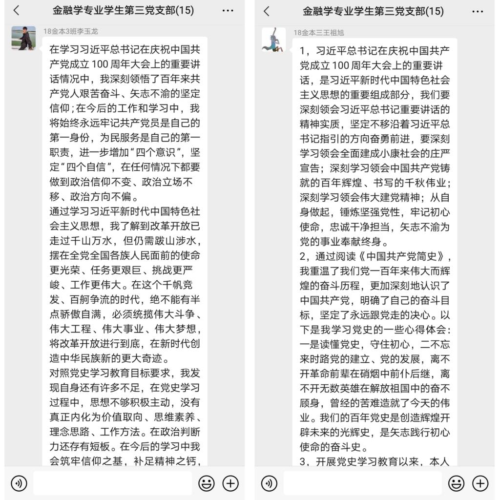 杨思琦同学说:“在学习方面,我认真学习了相关资料,对照党史学习教育目标要求,坚定理想信念,弥补自身的差距与不足。在工作方面,要增强历史自觉,按时完成该做的事情,每周分享学习强国,同大家一起学习。在生活方面,无论是抗洪还是抗疫,都会尽自己的一份力,同时也希望疫情早日结束,国泰民安。”