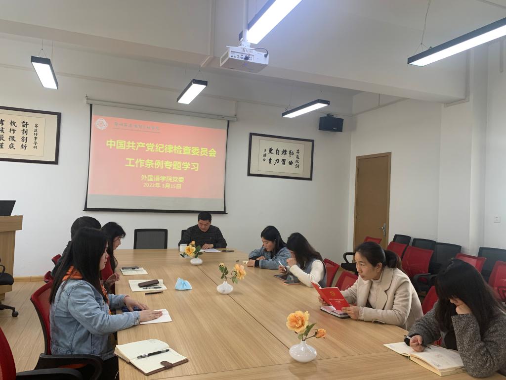 为进一步加强和规范新时代党的纪律检查工作,3月15日上午,外国语学院党委在教一楼206会议室召开《中国共产党纪律检查委员会工作条例》专题学习工作会,会议由党委书记石皓召同志主持,院党委部分委员及各支部书记参加。