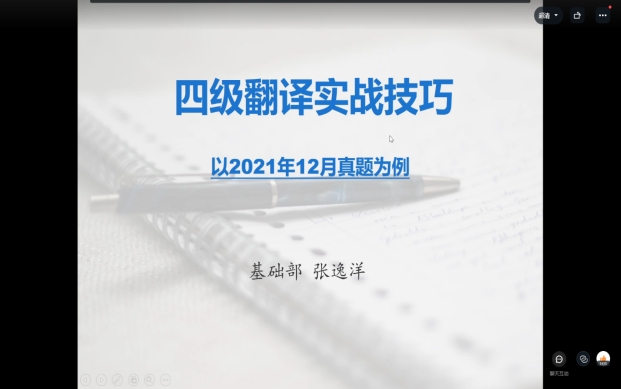 4月8日晚,基础部大学英语第二教研室张逸洋老师通过钉钉联播的方式,为即将参加2022年6月份大学英语四级考试的学生进行了一场题为“四级翻译实战技巧——以2021年12月真题为例”的讲座。讲座持续90分钟,基础部全体英语老师和1300多名同学在线聆听了讲座。