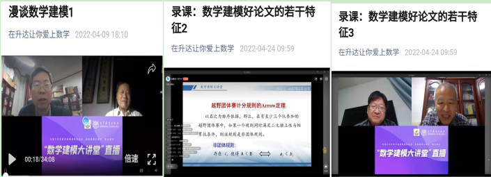截止目前,已开展3期:4月7日,第一期浙江大学陈叔平教授主讲的“漫谈数学建模”;4月14日,第二期清华大学姜启源教授主讲的“案例的深入研究与拓展训练—浅谈如何学习数学建模”;4月21日,第三期国防科技大学吴孟达教授主讲“数学建模好论文的若干特征”;平均每周1期,后续还有5期。