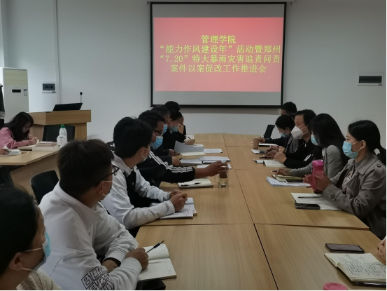 为扎实做好“能力作风建设年”活动与“7·20”特大暴雨灾害追责问责以案促改工作,管理学院于2022年4月30日上午在2号楼305会议室召开了“能力作风建设年”活动暨郑州“7·20”特大暴雨灾害追责问责案件以案促改工作推进会。管理学院党委书记职正路和各党委委员、党支部书记参加了此次会议。