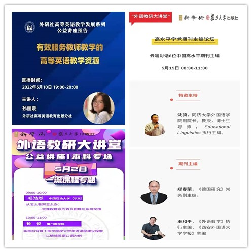 针对教师们教改科研方面的需求,组织教师们参加了《高水平学术期刊主编论坛》,云端对话6位中国高水平期刊主编,针对教师们线上教学和资源平台建设,组织了《有效服务教师教学的高等英语教学资源》线上讲座,详细教学资源建设和智慧教学工具使用方法,以及借助智慧教学工具开展网络课程建设、资源库资源引用、课堂互动等内容。另外,组织全体教研室教师参加了由中国石油大学毛浩然教授、厦门医学院钟俊教授等进行的《一流课程》专题讲座,分别从教育教学能力提升、一流课程建设、教师教学大赛、有效教学设计、线上课程策略等方面进行论述,反响热烈。