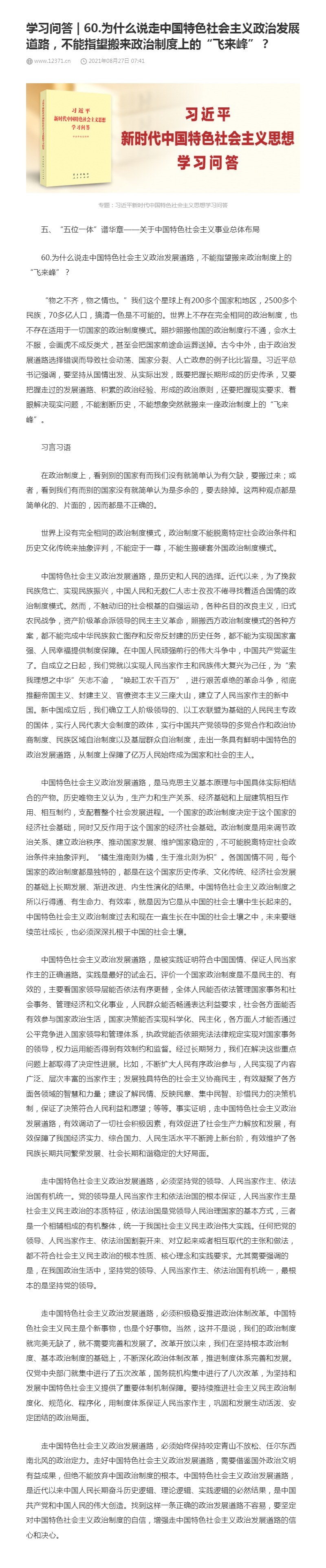 60.为什么说走中国特色社会主义政治发展道路,不能指望搬来政治制度上的“飞来峰”?