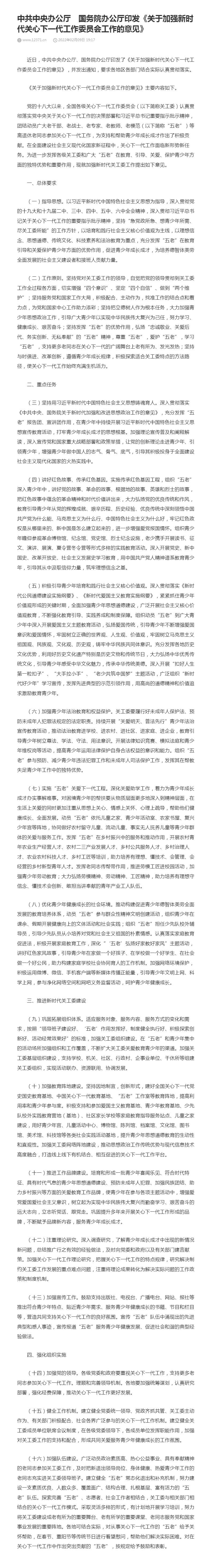 【2022年文件汇编】中共中央办公厅 国务院办公厅印发《关于加强新时代关心下一代工作委员会工作的意见》