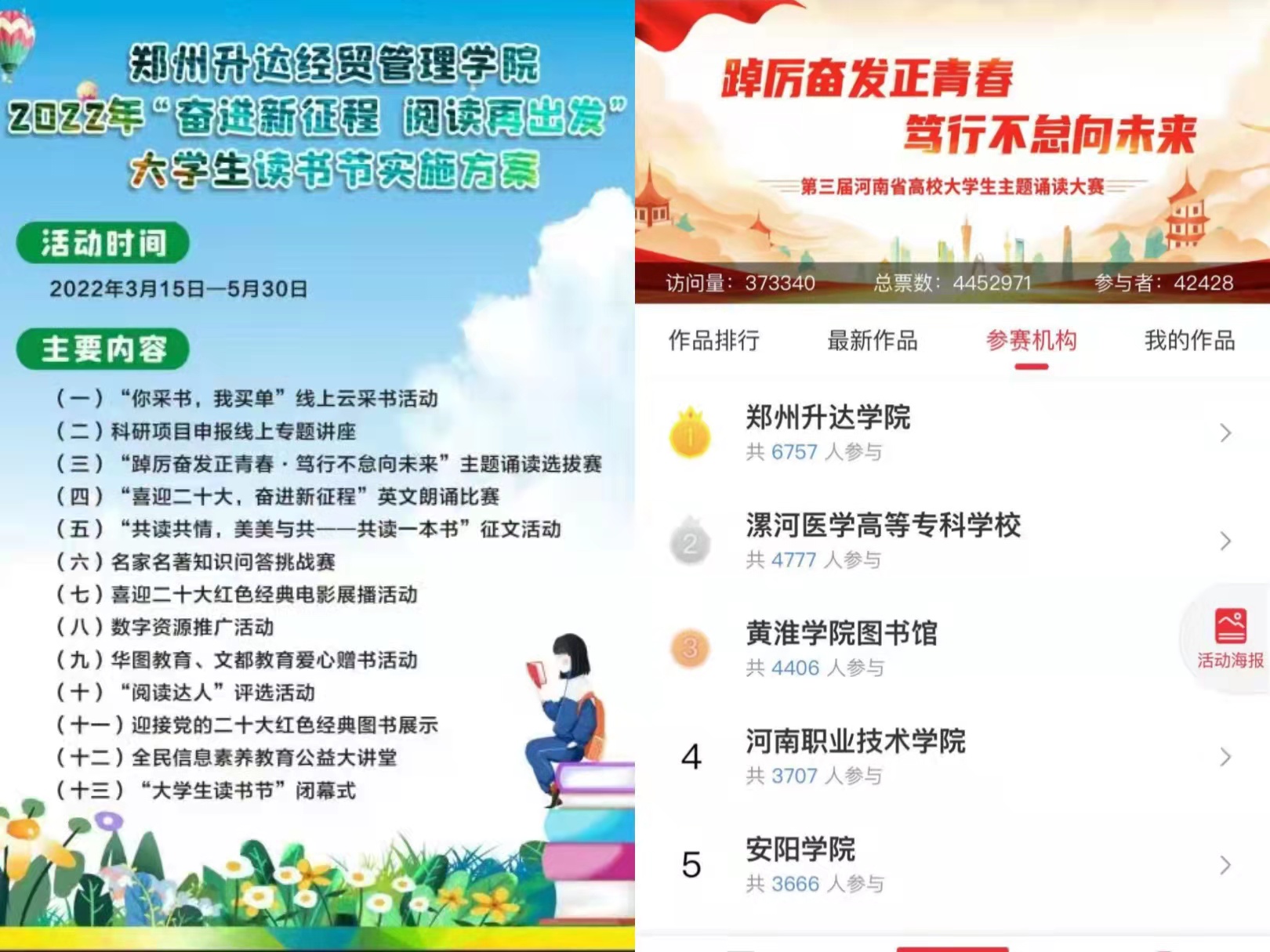 为弘扬中华优秀传统文化,滋养民族心灵,培育文化自信,图书馆积极策划举办“踔厉奋发正青春·笃行不怠向未来”主题诵读选拔赛,目前我校已有七千多名学生参加并提交作品,参赛人数居全省高校之首。同时,指导读书社倡议举办“共读共情,美美与共——共读一本书”征文活动也在蓬勃开展。积极参加河南省教育厅新媒体《不负春光,书香陪伴》征稿活动,安排图书馆员畅谈从业经历,分享阅读经验,联系两位辅导员推荐最值得阅读的《习近平谈治国理政》和余华《活着》。尽一切可能让师生能在这些读书活动中收获真知,寻找人生真谛,消除心理焦虑。