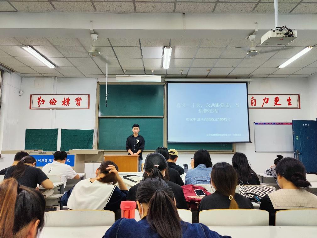 2022年4月27日,2019级物流管理本科一班团支部在综合楼306教室召开“喜迎二十大、永远跟党走、奋斗新征程”主题团课活动,活动由团支部书记郭佳铭召开,全体团员围绕主题“迎接党的二十大、奋斗新征程”进行赞礼活动。