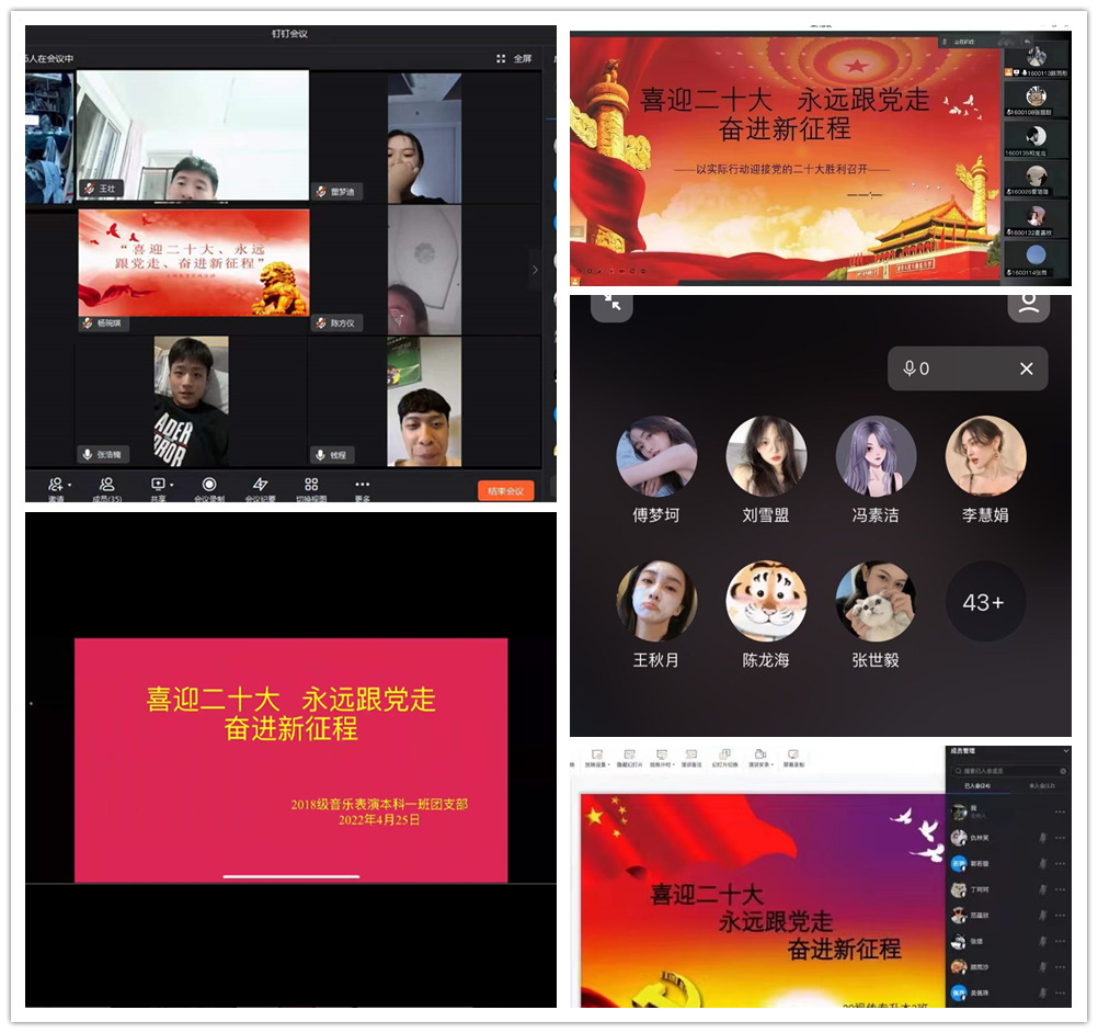 2022年是党的二十大召开之年,是中国共产主义青年团成立100周年。4月25日至4月27日,艺术学院2018级年级团总支各班团支部陆续开展了“喜迎二十大、永远跟党走、奋进新征程”主题教育学习活动。
