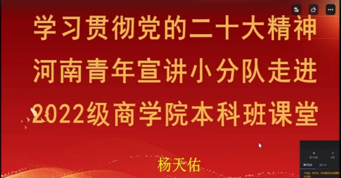为学习贯彻党的二十大精神,根据校团委安排,11月16日上午8时,省管高校学习宣传贯彻二十大精神河南青年宣讲小分队成员、我校马克思主义学院杨天佑教授走进我校商学院2022级市场营销本科班,为同学们作题为《掌握“九个一”,领会党的二十大——深入学习贯彻党的二十大精神》专题宣讲。