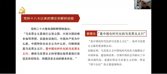 随后,他从党的二十大的主题和主要成果、过去5年的工作和新时代10年的伟大变革、马克思主义中国化时代化、新时代新征程中国共产党的使命任务、各项重大部署等方面,对党的二十大精神进行了系统阐释和深入解读;最后,从当今时代的青年发展境遇、使命责任及如何实现完成使命对党的二十大精神进行青年化阐释,勉励同学们牢记领袖嘱托,立志做有理想、敢担当、能吃苦、肯奋斗的新时代好青年,用青春奋斗汇聚起全面建设社会主义现代化、全面推进中华民族伟大复兴的磅礴力量。