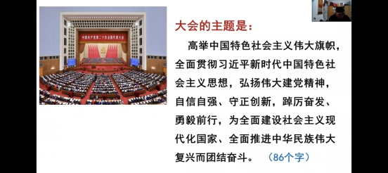杨老师讲到,党的二十大是在全党全国各族人民迈上全面建设社会主义现代化国家新征程、向第二个百年奋斗目标进军的关键时刻召开的一次十分重要的大会,大会作出的各项决策部署、取得的各项成果,必将对全面建设社会主义现代化国家、全面推进中华民族伟大复兴,对夺取中国特色社会主义新胜利发挥十分重要的指导和保证作用。党的二十大和二十届一中全会选举产生以习近平同志为核心的新一届中央领导集体,习近平同志继续担任中共中央总书记、中央军委主席,充分反映了包括亿万青年在内的全党全军全国各族人民的共同心愿,必将进一步鼓舞全国人民团结一心、勇毅前行的奋斗热情。