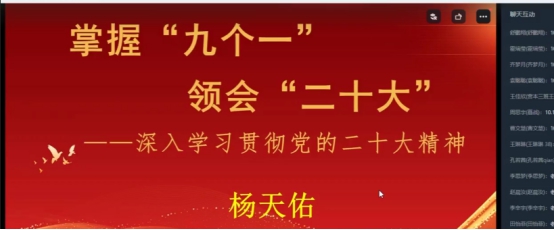 讲座围绕“一次十分重要的大会、一个鲜明的主题、一场伟大的变革、一个新的思想境界、一项新的使命任务、一项新的战略布暑、一项新的伟大工程、一个新的寄托、一次新的号召”九个方面,对党的二十大精神进行系统阐释和深入解读。