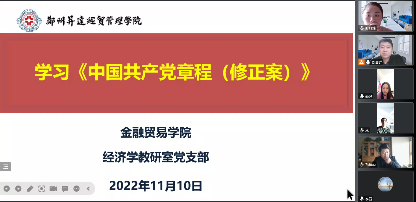 10月22日,党的二十大闭幕会通过了关于《中国共产党章程(修正案)》的决议。为深入学习贯彻党的二十大精神,11月10日下午,金融贸易学院经济学教研室党支部召开线上腾讯会议,在支部书记刘合群同志的带领下,共同学习和探讨了党的二十大精神及《中国共产党章程(修正案)》。